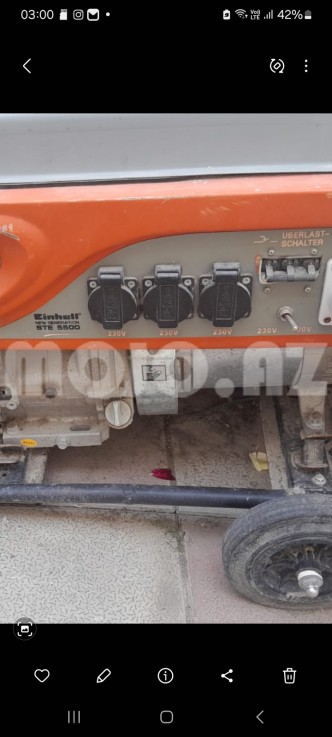 Einhell markalı portativ elektrik generatoru. Üç ədəd standart elektrik yuvası və bir ədəd daha böyük yuvası var. Metal konstruksiyası və təkərləri sayəsində daşınması asandır. Elektrik enerjisinə ehtiyac olan yerlərdə istifadə üçün əlverişlidir.real aliciya endirim.olunacaq |
