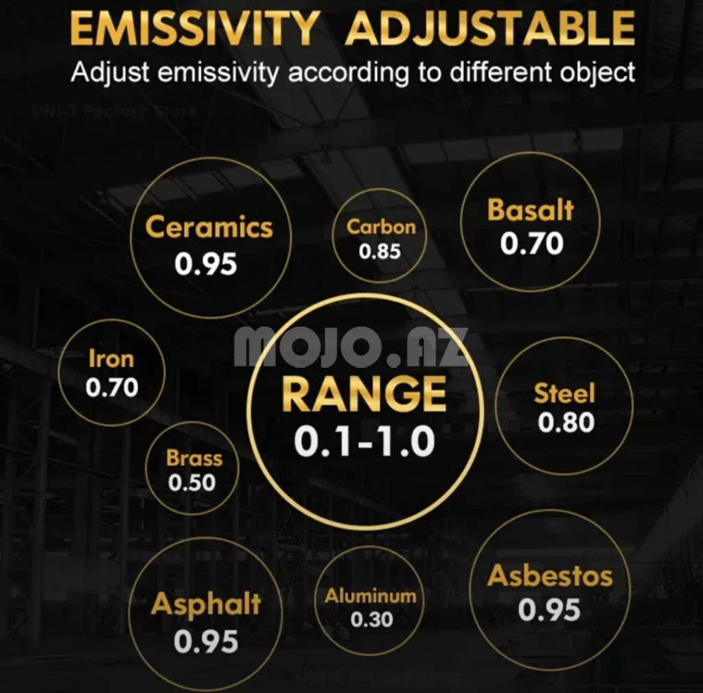 Termometr tənzimlənən emissiya qabiliyyətinə malikdir və metaldan plastikə və keramikaya qədər müxtəlif materiallarda dəqiq oxumalara imkan verir.