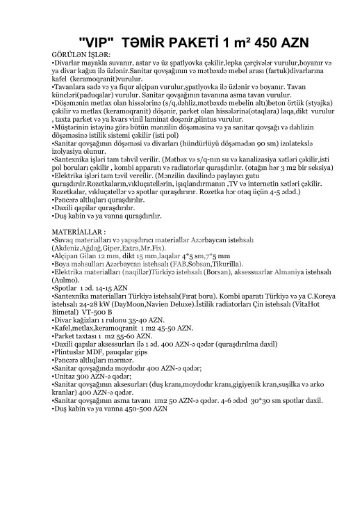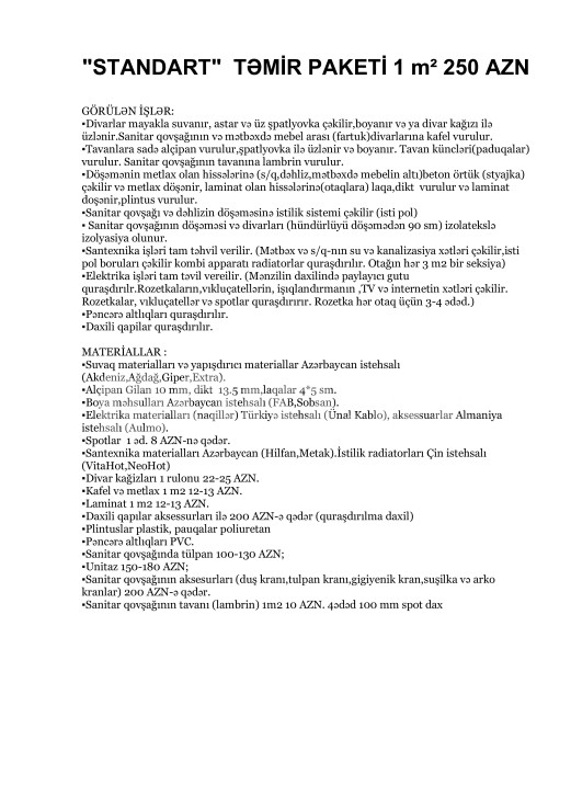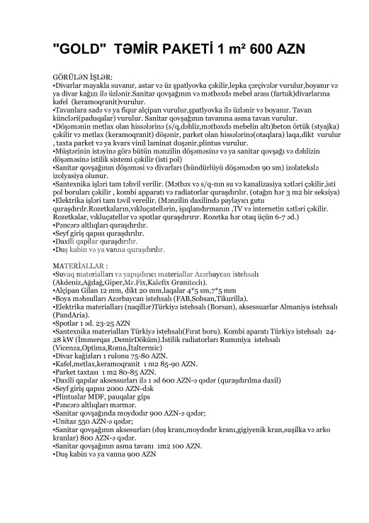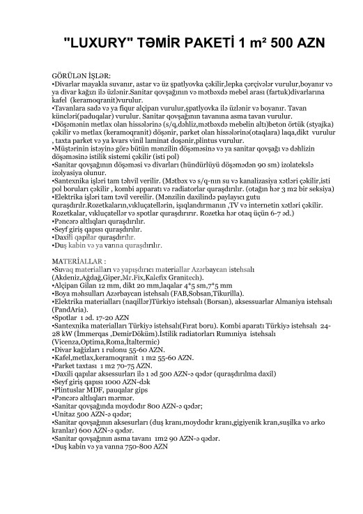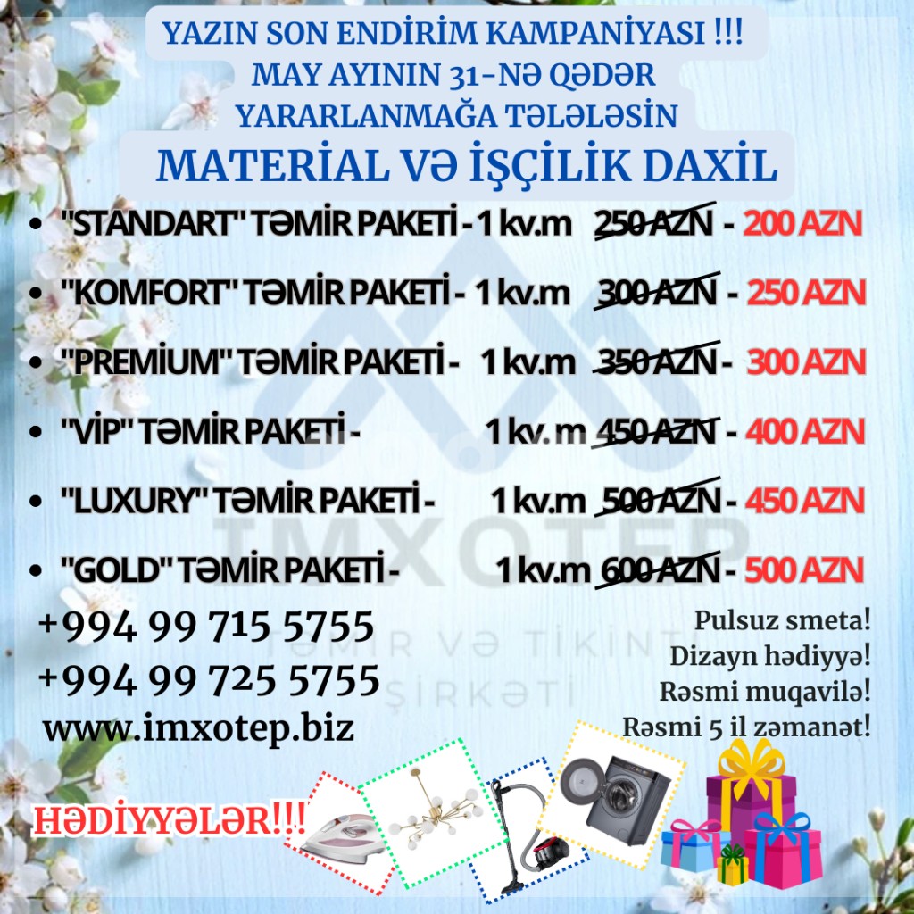 hər büdcəyə uyğun təmi̇r paketləri̇.Qi̇ymətlərə materi̇allar və usta pulu daxi̇ldi̇r!