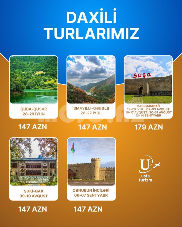 QUBA QUSAR 28-29 iyun 147 CAN QARABAĞ 19-20 iyul 179 azn İSMAYILLI QƏBƏLƏ 26-27 iyul 147 azn CAN QARABAĞ 2-3 Avqust 179 azn ŞƏKİ QAX 9-10 Avqust 147 azn CAN QARABAĞ 16-17 avqust 179 azn GƏDƏBƏY GÖYGÖL GƏNCƏ 23-24 avqust 147 azn CAN QARABAĞ 30-31 avqust 179 azn CƏNUBUN İNCİLƏRİ 6-7 Sentyabr 147 azn CAN QARABAĞ 13-14 Sentyabr 179 azn “Səyahətinizi işinizin ustası ilə edinki hər aniniz dəyərli olsun” 😊