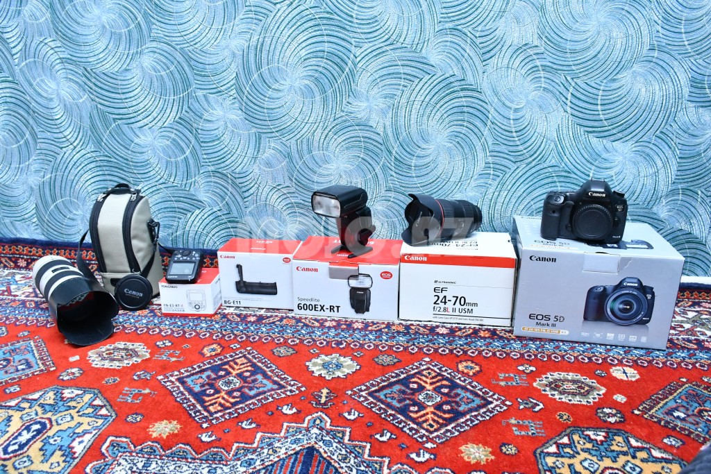 Canon 5d mark 3 body Lens 24-70 1;2.8 II USM Lens 70-200 1;.2.8 IL USM Flesh canon 600 ex rt Triger younguno Canon 5d mark 3 uçun grift Fotokemer Boyuk foto çanta