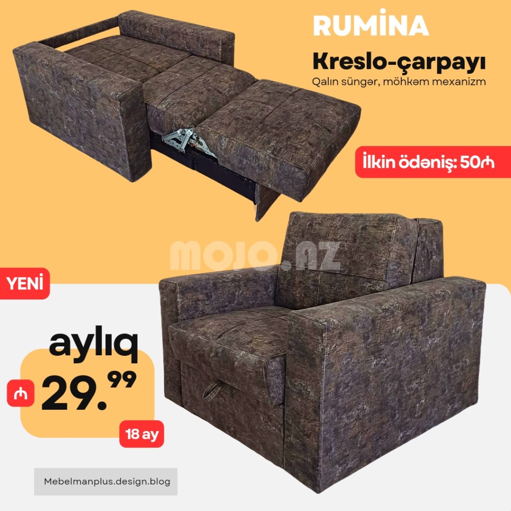 Sərfəli kredit şərtləri ilə RUMİNA amerikanka tipli kreslo-çarpayı modelini hər kəs ala biləcək. İstənilən rəng seçimi ilə sifariş edə biləcəyiniz bu məhsulun ideal keyfiyyətinə Zəmanət verilir. |