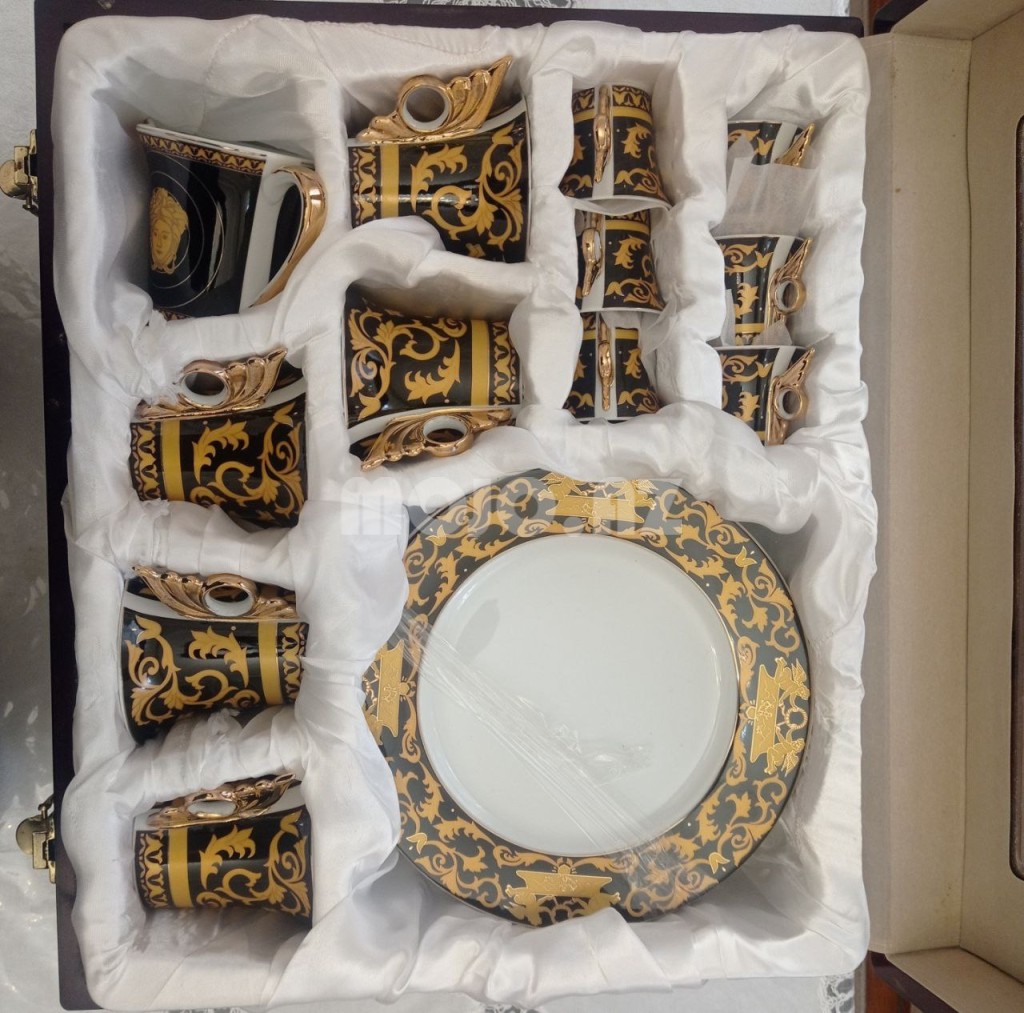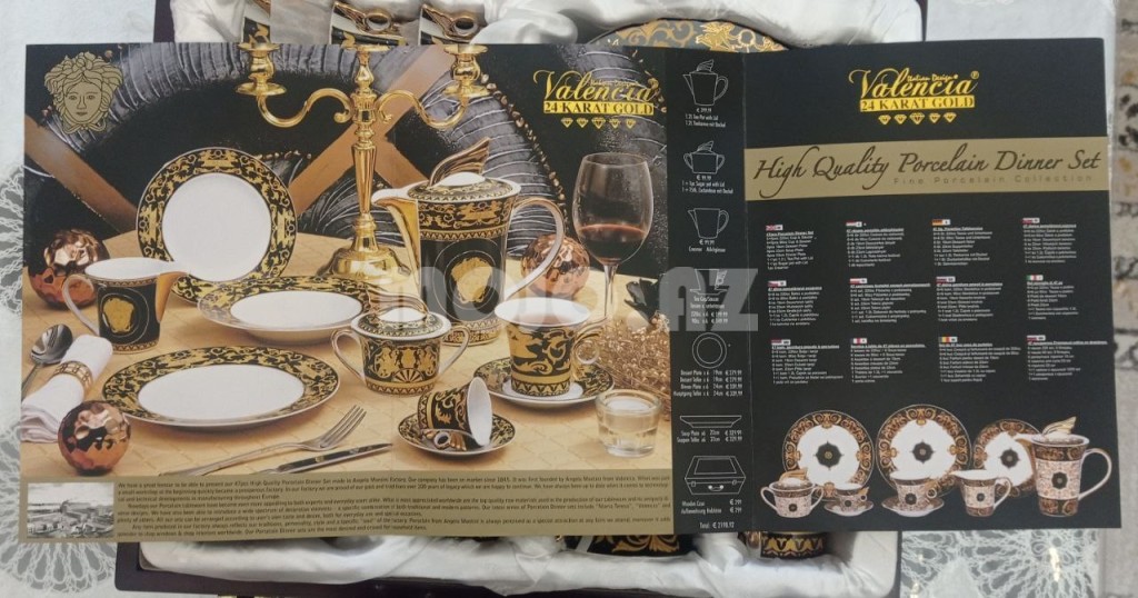 Orjinal serfikatlı İtalian madeli 24 karat qızıl qablardan ibarətdir. Valencia 24 karat Gold - 47 ədəd çay dəsti və nahar dəstindən olan qablardan ibarətdir. Pula ehtiyacım olduğu üçün satıram. Öz qiyməti orjinal qab bahadır, 2000 avrodan yuxarı qiyməti var. Bu şəkildə gördüyünüz Orjinal-Brend qabdır. Almaq istəyən buyursun,