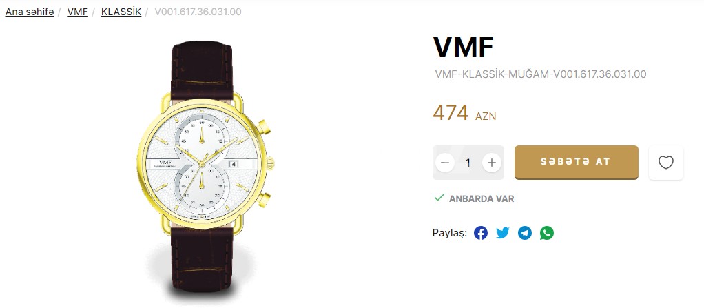 Saat yenidir, qutusundadir, istifadə olunmayıb. VMF.in saytında baxsanız görə bilərsiniz, saytda qiyməti 474 AZN.dir. Təcili satılır. Son qiymət 240 AZN. Saat istifadə etmədiyim üçün 50 faiz endirimlə satılır.